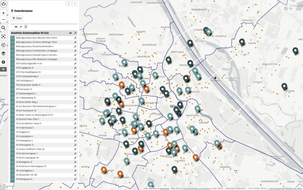 Die Karte der Radlobby zeigt Volksschulen und Sekundarstufen mit autofreiem Schulvorplatz, sowie Schulstraßen an: hier gehts zum link.